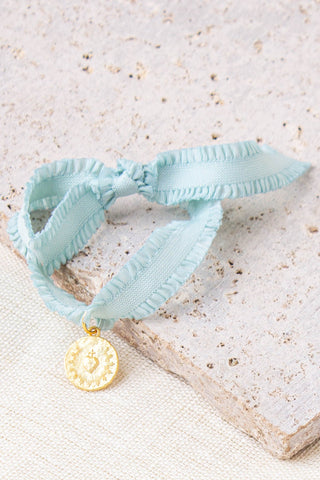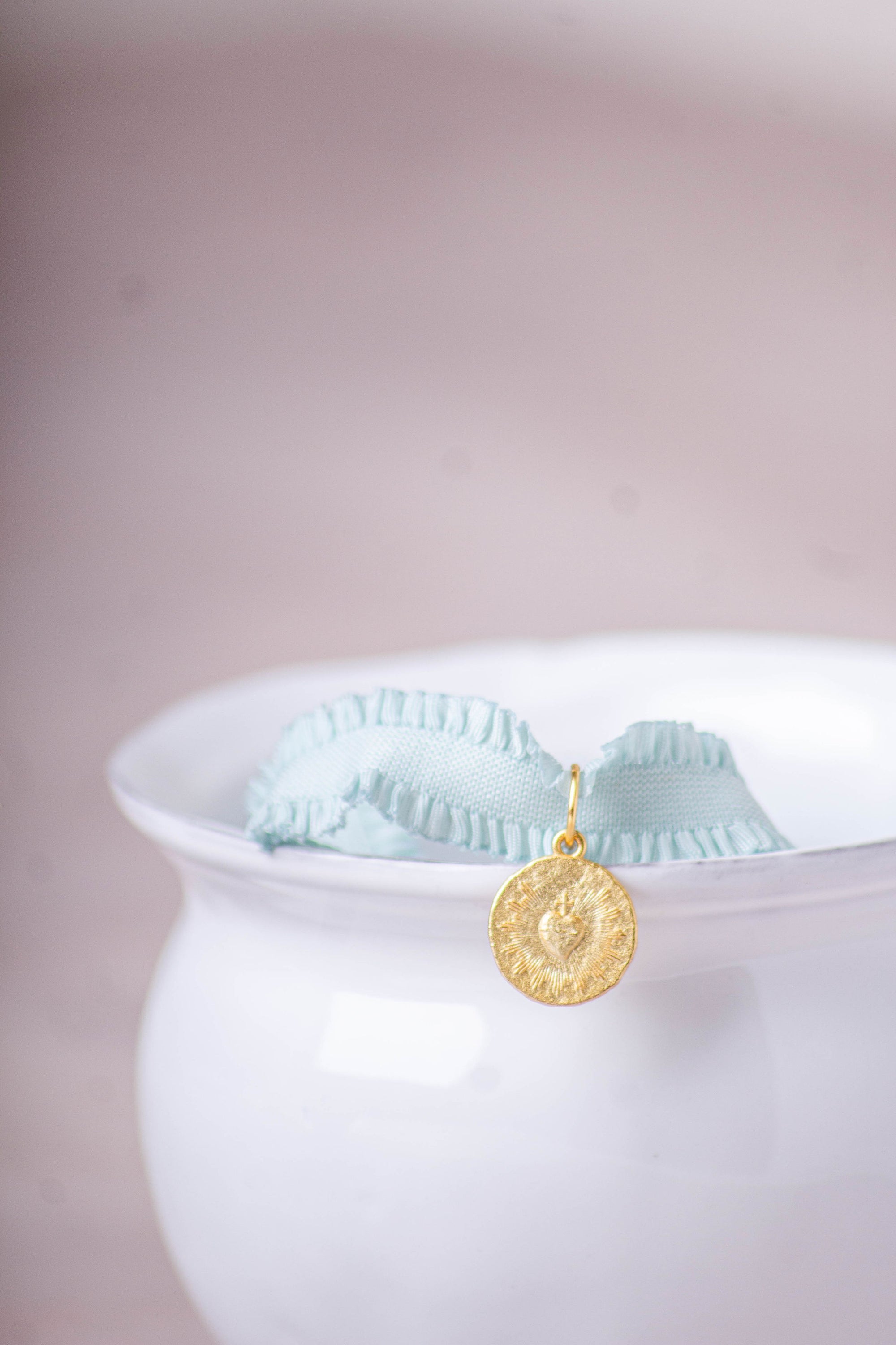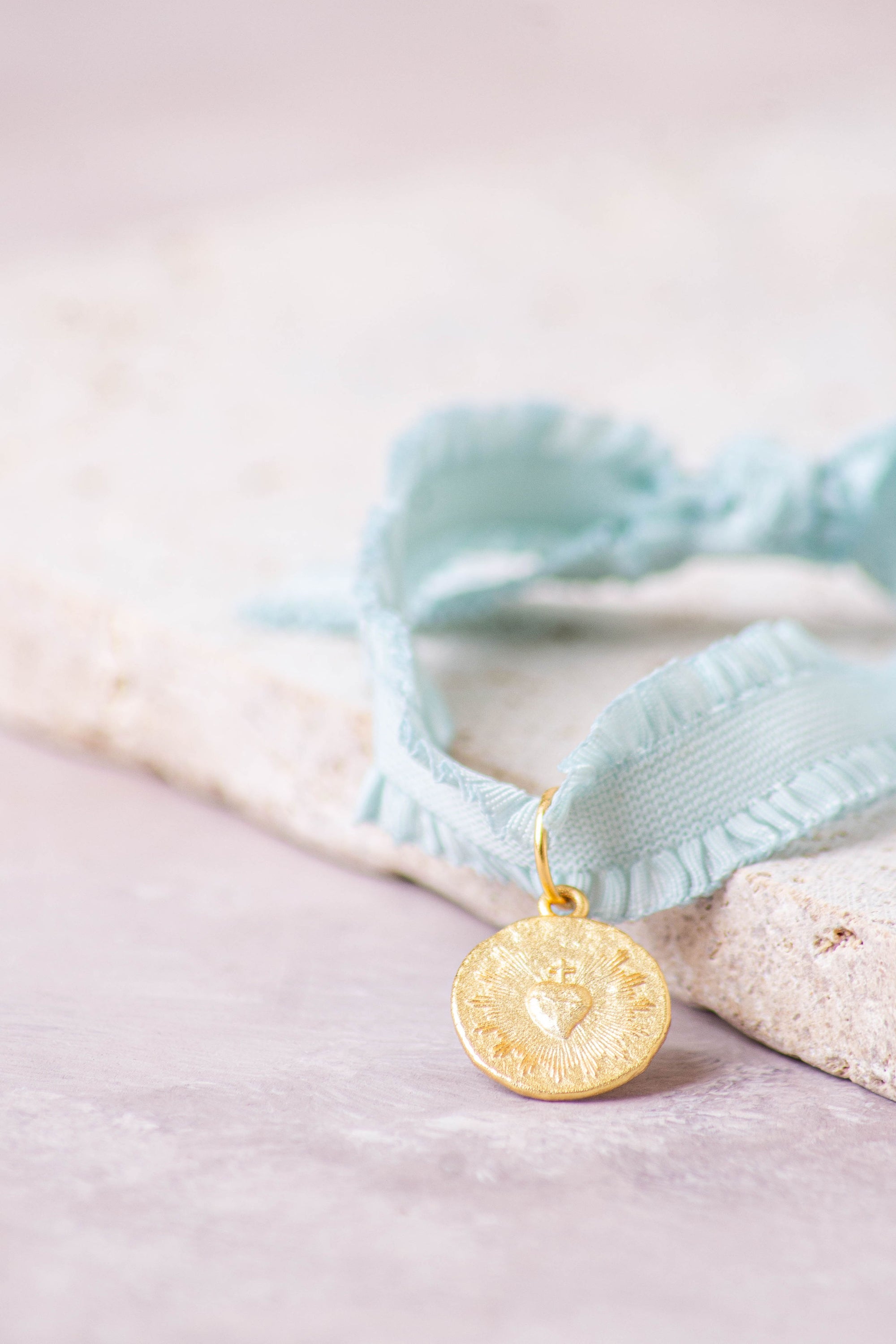 Son ruban extensible en tissu bleu-vert se noue facilement autour du poignet, tandis que la médaille dorée, ornée d’un coeur sacré, apporte une touche lumineuse et symbolique.