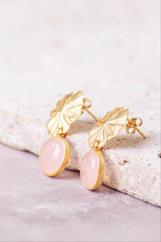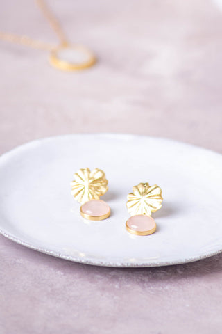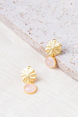Leur motif délicatement sculpté évoque un soleil stylisé, tandis que la pierre rose poudré diffuse une touche de tendresse et d’éclat.